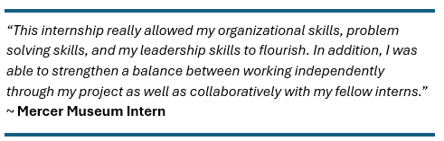 The BLBB Charitable Internship Program at Bucks County Historical Society-Mercer Museum and the Pennypack Ecological Restoration Trust allows two strong nonprofits to expand the impact of their missions and train the next generation of leaders in their respective fields together. The interns get hands-on experience, mentoring, and leadership skills throughout their employment. Exposure to career pathways and professional opportunities in their fields of interest is inspiring these students to pursue greater involvement and deeper engagement.